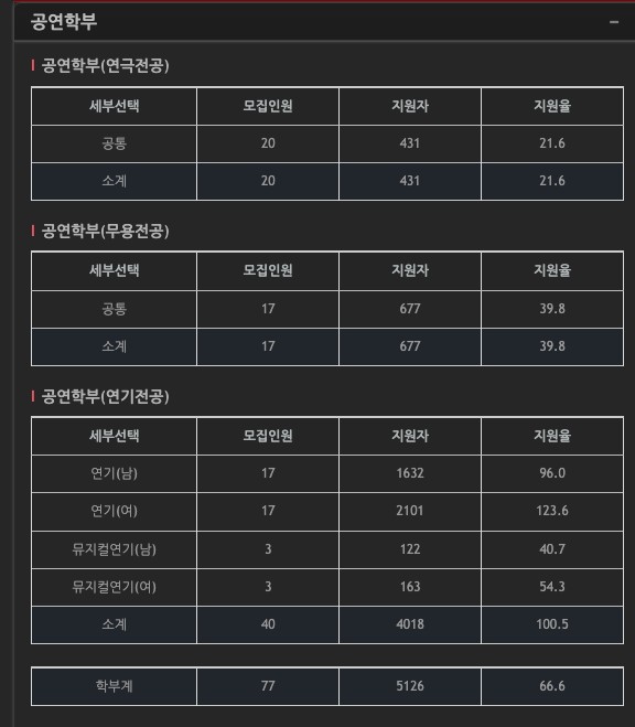 서울예술대학교 공연학부는 2024년도에 77명 모집을 했습니다. 이번 서울예술대학교 수시 응시생은 총 5126명으로, 총 66.6대1의 경쟁률을 기록했습니다. 서울예술대학교 공연학부에 설치된 전공은 연극전공, 무용전공, 연기전공 총 세 학과가 개설되어 있는데요. 각 학과에 대한 설명과 함께 세부 전공의 경쟁률을 알아보겠습니다.